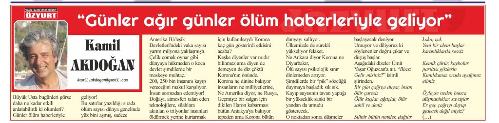 Bu satırlar yazıldığı sırada ölüm sayısı dünya genelinde yüz bini aşmış, sadece Amerika Birleşik Devletleri’ndeki vaka sayısı yarım milyona yaklaşmıştı.